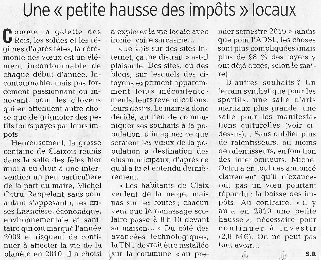 Et pour revenir sur les demandes des Claixois que brocardait le Maire, voilà un extrait d’un mail que j’ai reçu cet après midi (comme c’est un mail qui m’est adressé et pas un commentaire posté sur ce blog, j’en tairai l’auteur) :