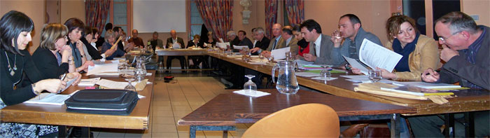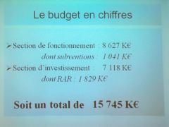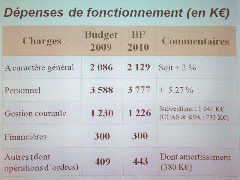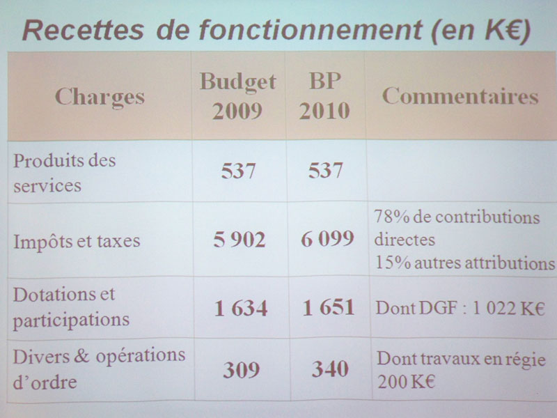 En une dizaine de minutes, montre en main, nous avons vu défiler les prévisions de recettes et de dépenses pour l’année 2010 (voir les photos des transparents enfin d’article) et nous avons eu très rapidement la conclusion qu’il fallait augmenter le taux des impôts de 2% (soit 4% en réel puisque les bases de l’imposition augmentent aussi de 2 % cette année).