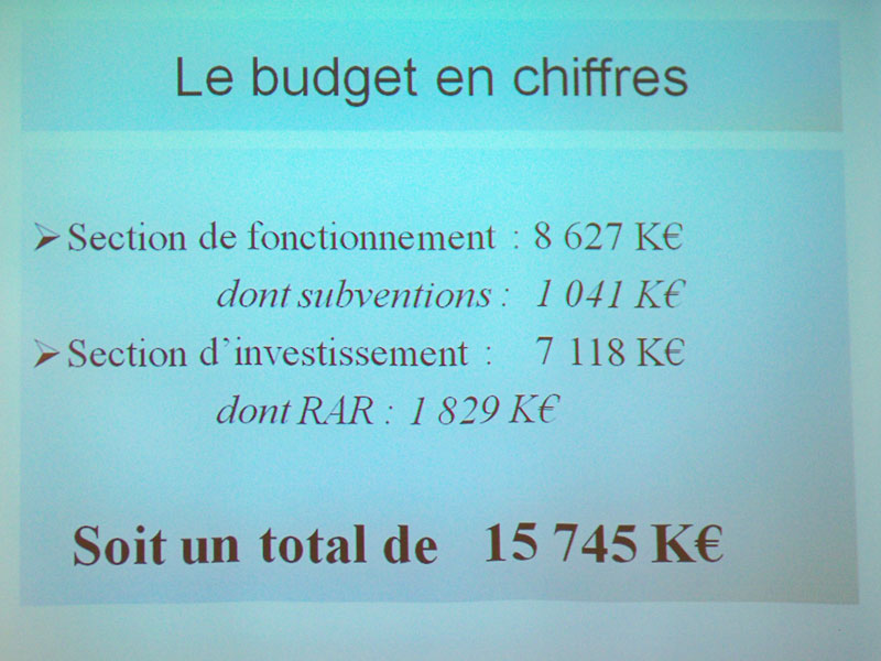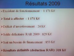 Quand on regarde de près les quelques chiffres présentés, on découvre un « reste à réaliser » (RAR) de  829 000 Euros et un résultat excédentaire de 318 000 Euros en 2009. Ce qui veut tout simplement dire que l’on a perçu trop d’impôts en 2009 (les 318 000 Euros) et qu’on a pas terminé les travaux prévus en 2009 (pour 829 000 Euros)… à quelques détails techniques près.