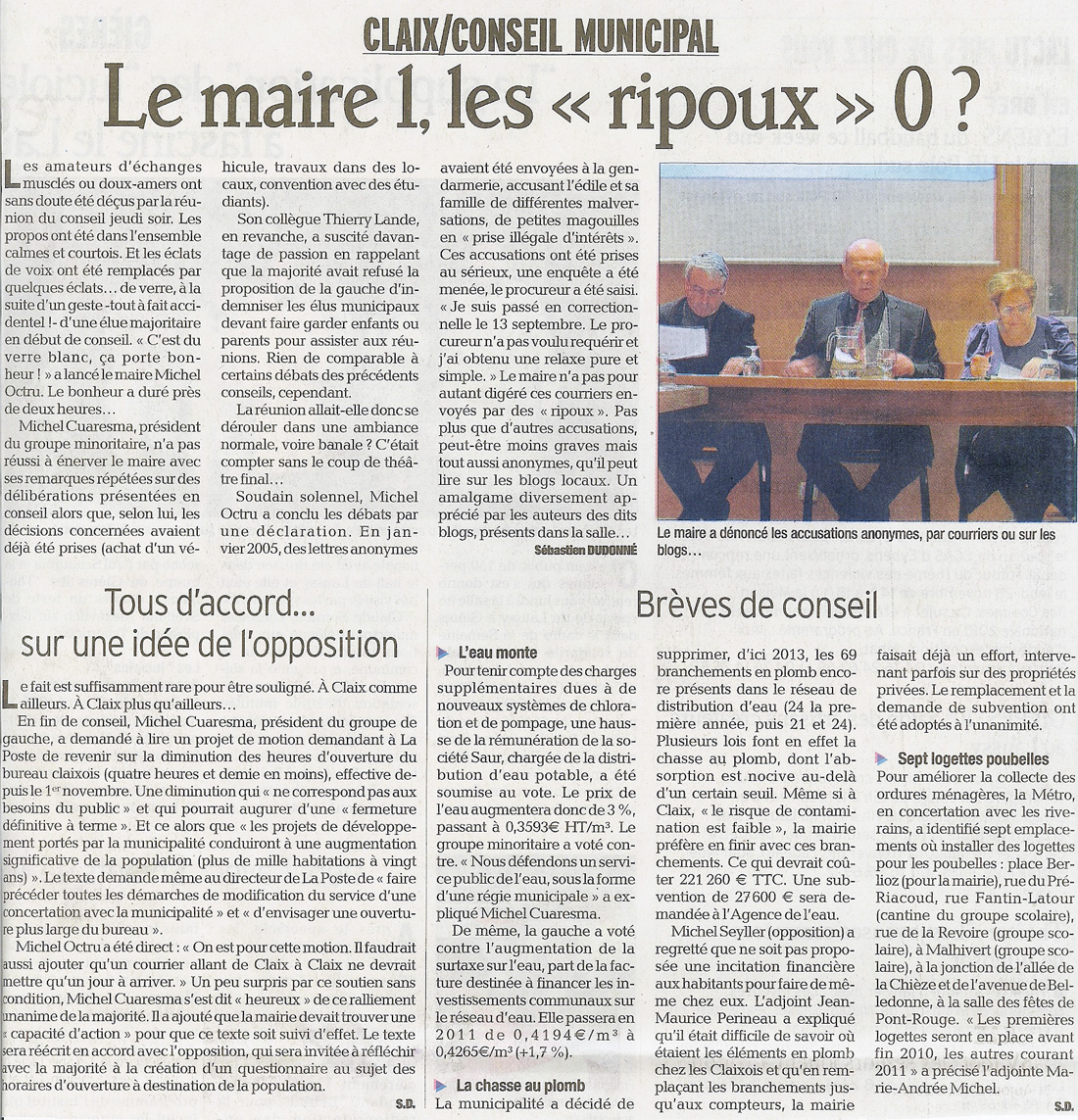 L’affaire remonte à quelques années, des lettres anonymes avaient conduit des enquêteurs judiciaires à s’intéresser de près à d’éventuelles prises illégales d’intérêt, concussions et autres irrégularités (dixit MO). Jusque là on en était au niveau de l’information, pas grand-chose à redire si ce n’est la surprise générale à l’annonce du passage en correctionnelle. Mais où c’est devenu un peu plus glauque, c’est quand Michel Octru a tenté de nous suggérer de « chercher à qui profite le crime » sans bien évidement nommer quiconque (le risque de diffamation n’étant pas très loin !) et essayé de faire l’amalgame avec les commentaires anonymes de certains blogs claixois…