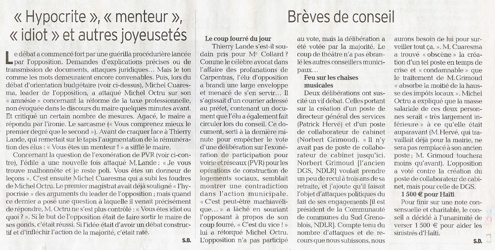 C’est ce que risquent de retenir les lecteurs du Dauphiné Libéré qui se sont intéressés au compte rendu du conseil municipal du 28 janvier dernier (voir l’article à droite). Dommage, parce cette page du DL est lue par tout le canton et c’est ainsi l’image de la commune qui est atteinte !