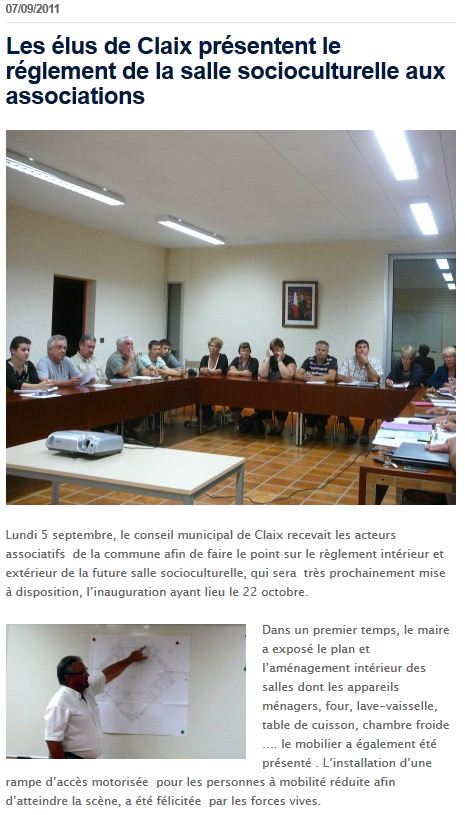 Vous pouvez lire l’article complet sur : http://roullet-saint-estephe-claix.blogs.charentelibre.fr/archive/2011/09/07/les-elus-de-claix-presentent-le-reglement-de-la-salle-socioc.html