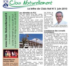 Elle reprend les thèmes que nous avons développés lors des 6 derniers mois sur ce blog : le PLU et ses démêlés juridiques, le conseil municipal qui se sclérose. Elle traite également des sujets qui nous sont chers comme le développement des transports en commun, la mobilité douce ou le plan climat de Claix.