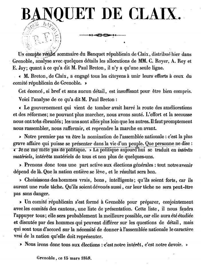 A Claix, cela fait longtemps que les élections mobilisent. J’en veux pour preuve le compte rendu du 15 mars 1848 du « Banquet de Claix ».