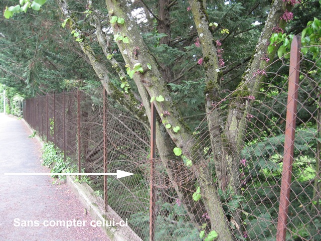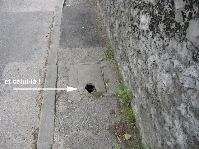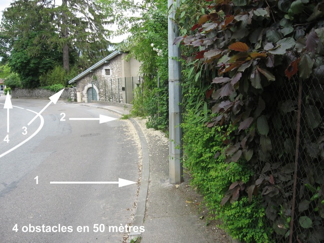 Citons, en redescendant : clôture grillagée éventrée et dépassant sur le trottoir (photo 2) ; réverbère ne laissant qu’une quarantaine de centimètres de passage (photo 1 -1) ; branche d’arbuste récemment cassée et barrant complètement le trottoir (photo 1-2) ; angle d’une dépassée de toiture se situant à environ 1, 74 m de haut par rapport au trottoir (photo 1-3) ; largeur ridicule du trottoir le long du mur qui précède le carrefour le la rue de la Ronzy ; trappon ciment d’un regard, cassé (photo 3) ; feuillages d’une propriété descendant à 1,72 m et obligeant à se baisser, surtout les jours de pluie (photo 1-4).