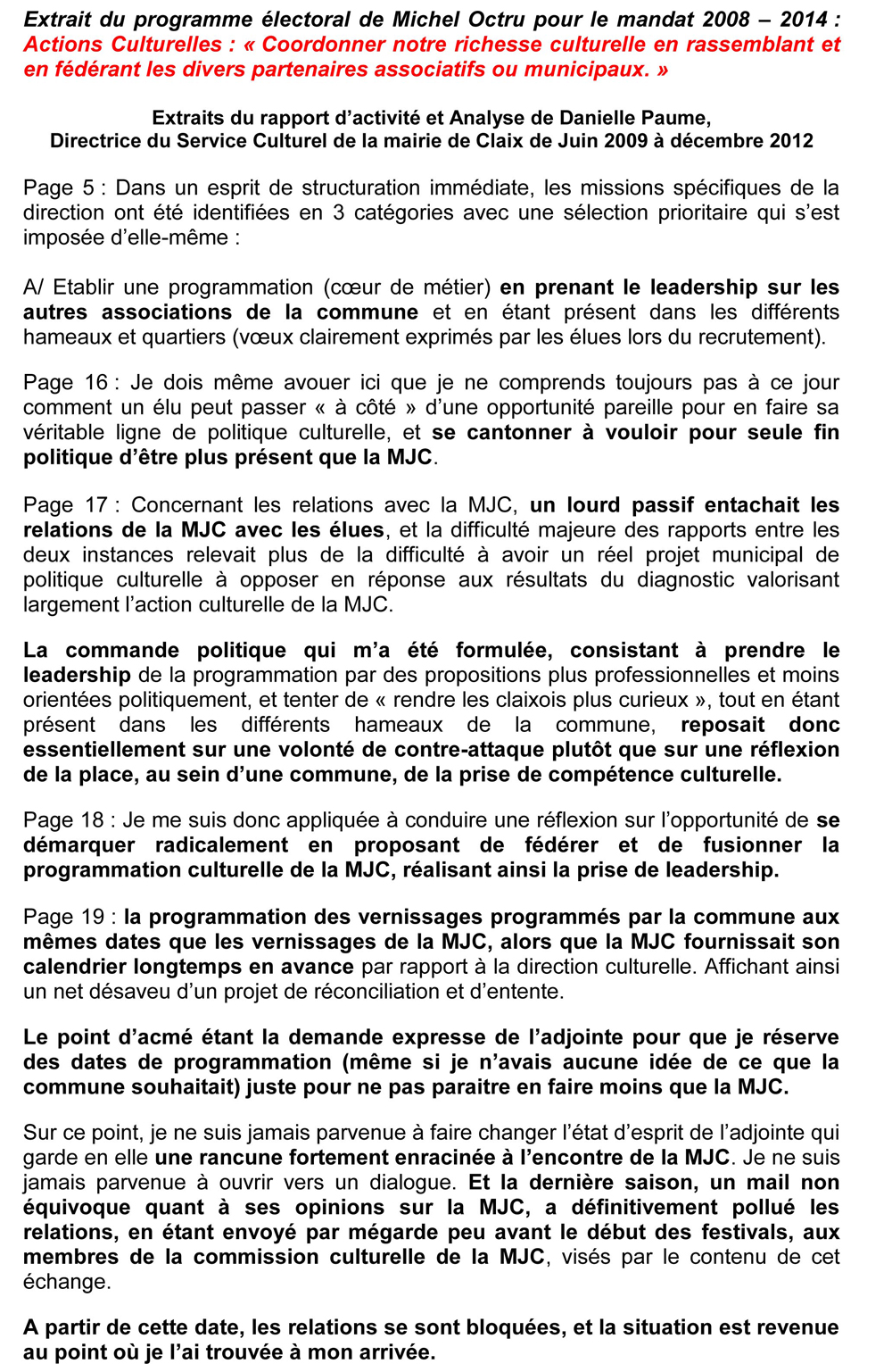 Pour faire le bilan de ce qu’entend la municipalité de Michel Octru par rassembler et fédérer, je vous laisse lire quelques extraits du document produit en janvier 2013 par Danièle Paume la Directrice du Secteur Culturel de Claix de 2009 à fin 2012 :