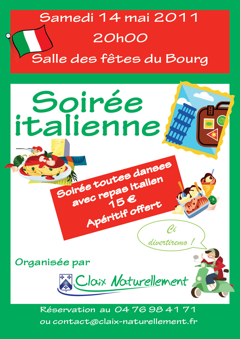 Samedi 14 mai 2011 à 20 heures à la salle des fêtes du Bourg de Claix pour la soirée italienne.