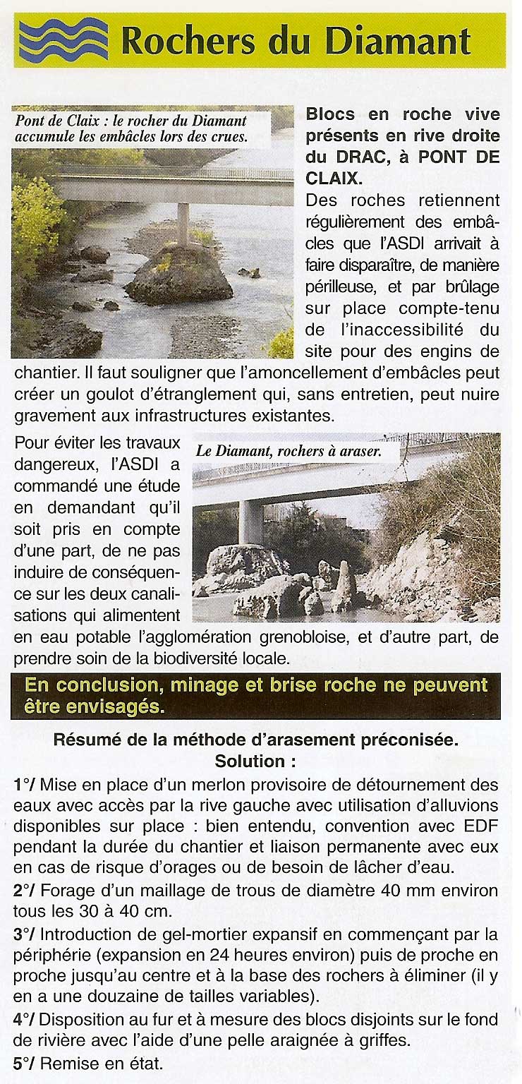 Si je vous en parle c’est que je viens de recevoir la plaquette de l’ASDI (Association Syndicale Drac Isère) qui nous explique que très prochainement, à ce même endroit, à proximité du rocher appelé « le Diamant du Drac », vont avoir lieu des travaux de remise en état du lit du Drac pour éviter les embâcles (voir copie en bas de l’article).