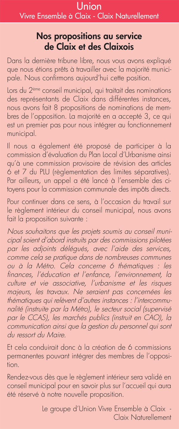 Lors du 2ème conseil municipal, qui traitait des nominations des représentants de Claix dans différentes instances, nous avons fait 8 propositions de nominations de membres de l’opposition. La majorité en a accepté 3, ce qui est un premier pas pour nous intégrer au fonctionnement municipal.