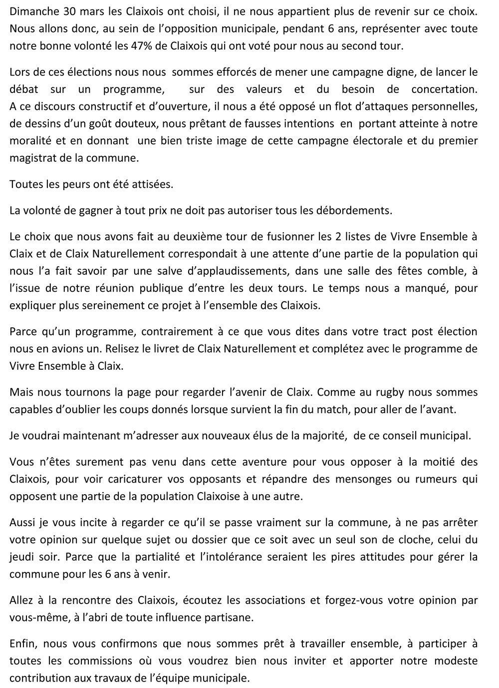 « La politique que vous avez menée depuis votre élection en 1989, renouvelée en 1995, 2001 et 2008 ne correspond en aucune façon au projet que j’ai défendu lors de notre campagne pour ces élections municipales de 2014 sur la liste Vivre Ensemble à Claix puis la liste d’union Vivre Ensemble à Claix – Claix Naturellement.