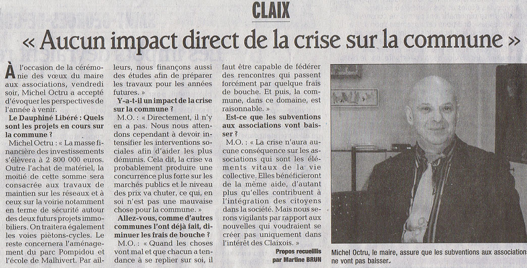 Les Claixois lecteurs du Dauphiné Libéré n’en sont toujours pas revenus : notre Maire l’affirme, «la crise n’aura pas d’impact direct sur la commune».